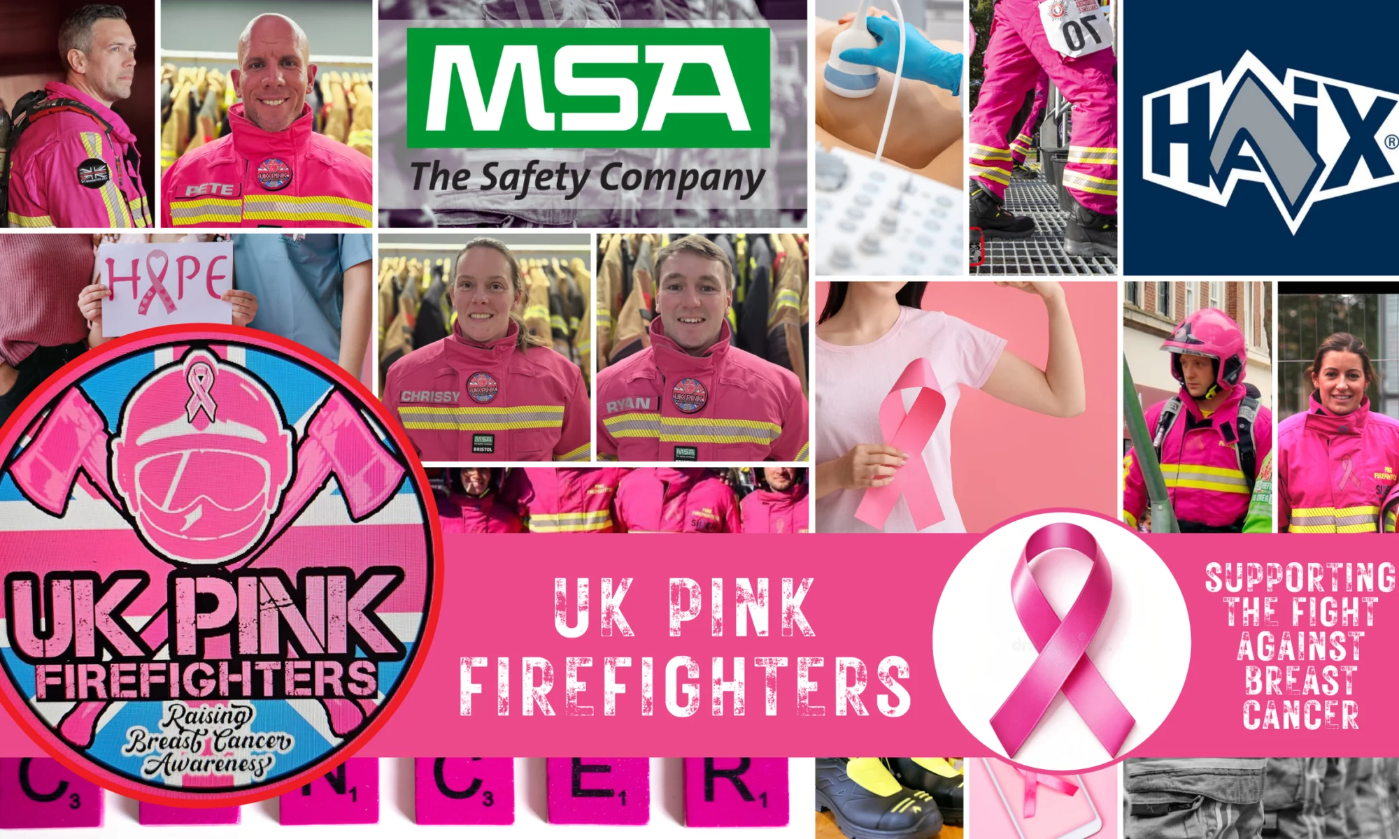 Firefighters in pink kit, standing with everyone affected by breast cancer.